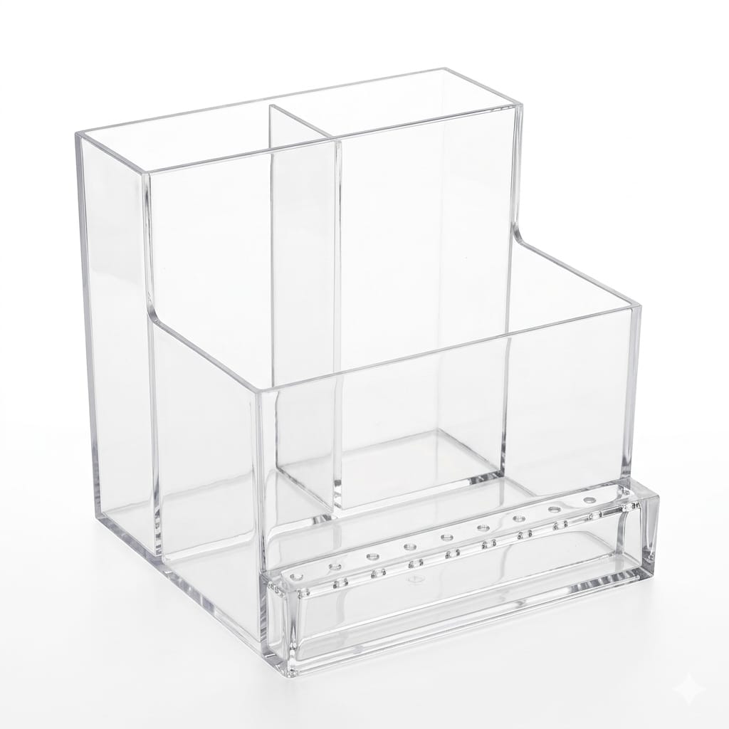 Prático e funcional, o Organizador de Mesa em Acrílico possui 3 divisórias, e mais mais uma superficie com 10 buraquinhos para guardar as brocas para você manter seus equipamentos organizados e sempre à mão.